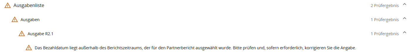 Im Jems gibt der Plausibilitäts-Check vor Einreichung eines Partnerberichts eine orange Hinweismeldung, wenn das Bezahldatum einer Ausgabe außerhalb des Berichtszeitraums liegt, der für den Partnerbericht im Reiter „Basis-Informationen“ ausgewählt wurde. Eine orange Hinweismeldung erlaubt das Einreichen des Partnerberichts. Der First Level Kontrolleur kann den Plausiblitäts-Check nach Einreichung des Partnerberichts ebenfalls auslösen, um zu prüfen, ob der Partnerbericht Ausgaben mit Bezahldatum außerhalb des Berichtszeitraum enthält.